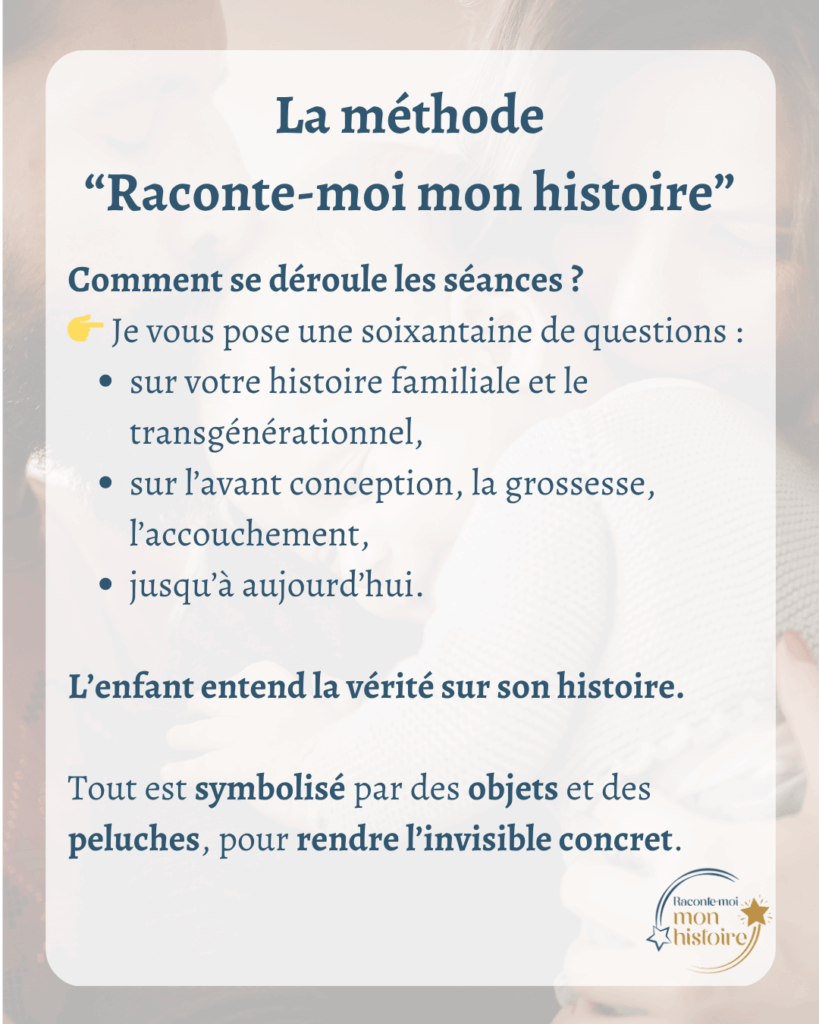Je pratique la méthode « Raconte-moi mon histoire » d’Audrey Mée. Cette approche permet de mettre des mots sur les maux et de libérer les mémoires émotionnelles dès le plus jeune âge (nourrissons, enfants et adolescents). Une séance dure 1h le tarif est de 60 euros.
